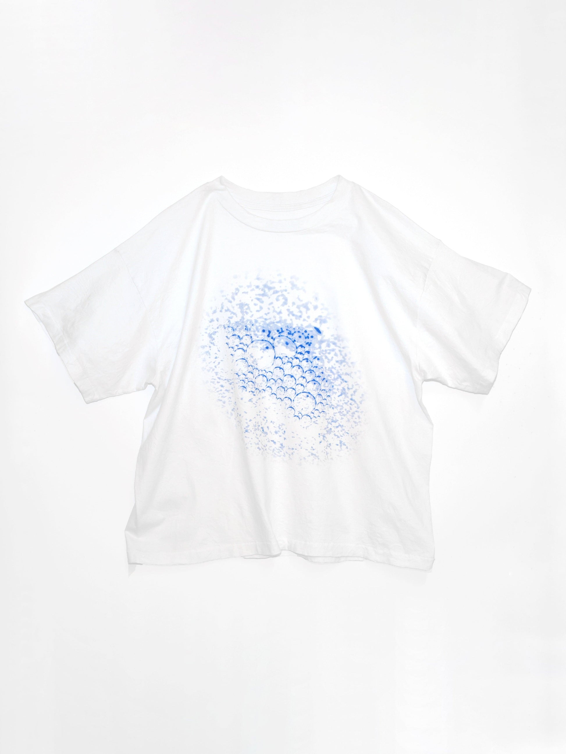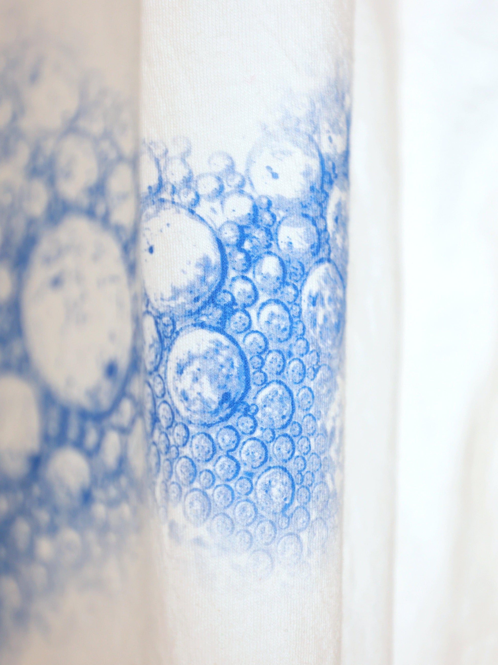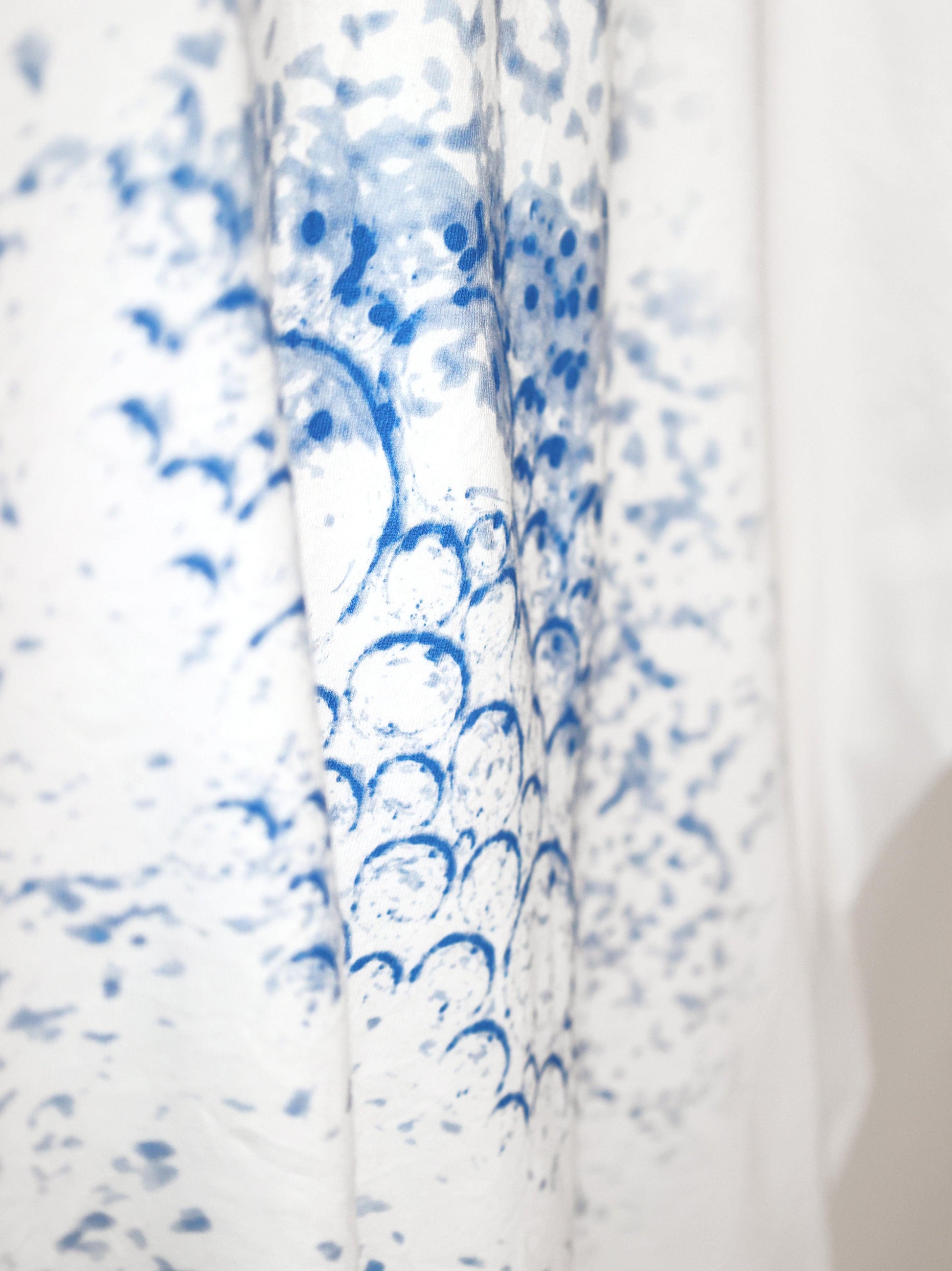 El estampado está formado por imágenes de burbujas en las orillas de Sopelana. El último rastro de la ola. Los últimos momentos antes de desaparecer. Para descompactar las camisetas se introducen en un recipiente lleno de agua y se giran poco a poco. Junto al recipiente y las camisetas se muestra un video a modo de tutorial para saber los pasos para descompactar la camiseta.