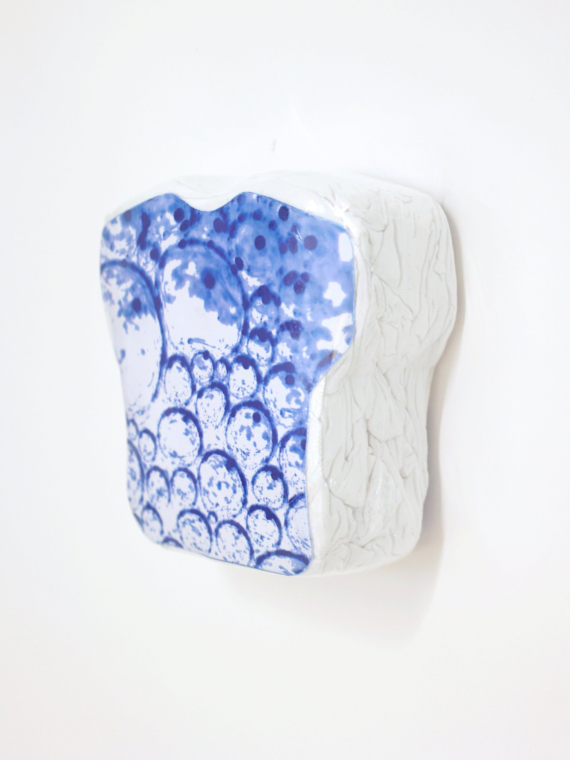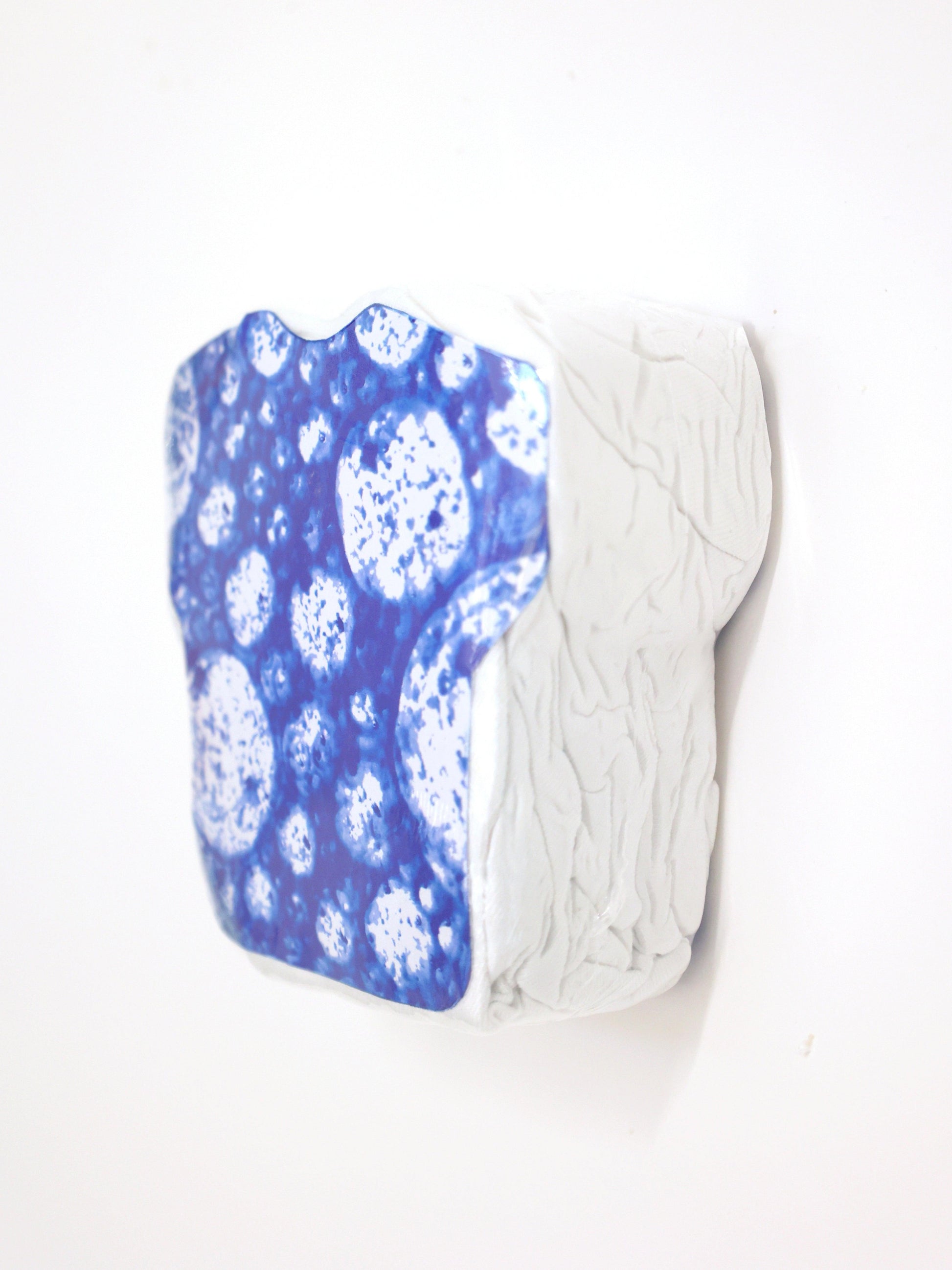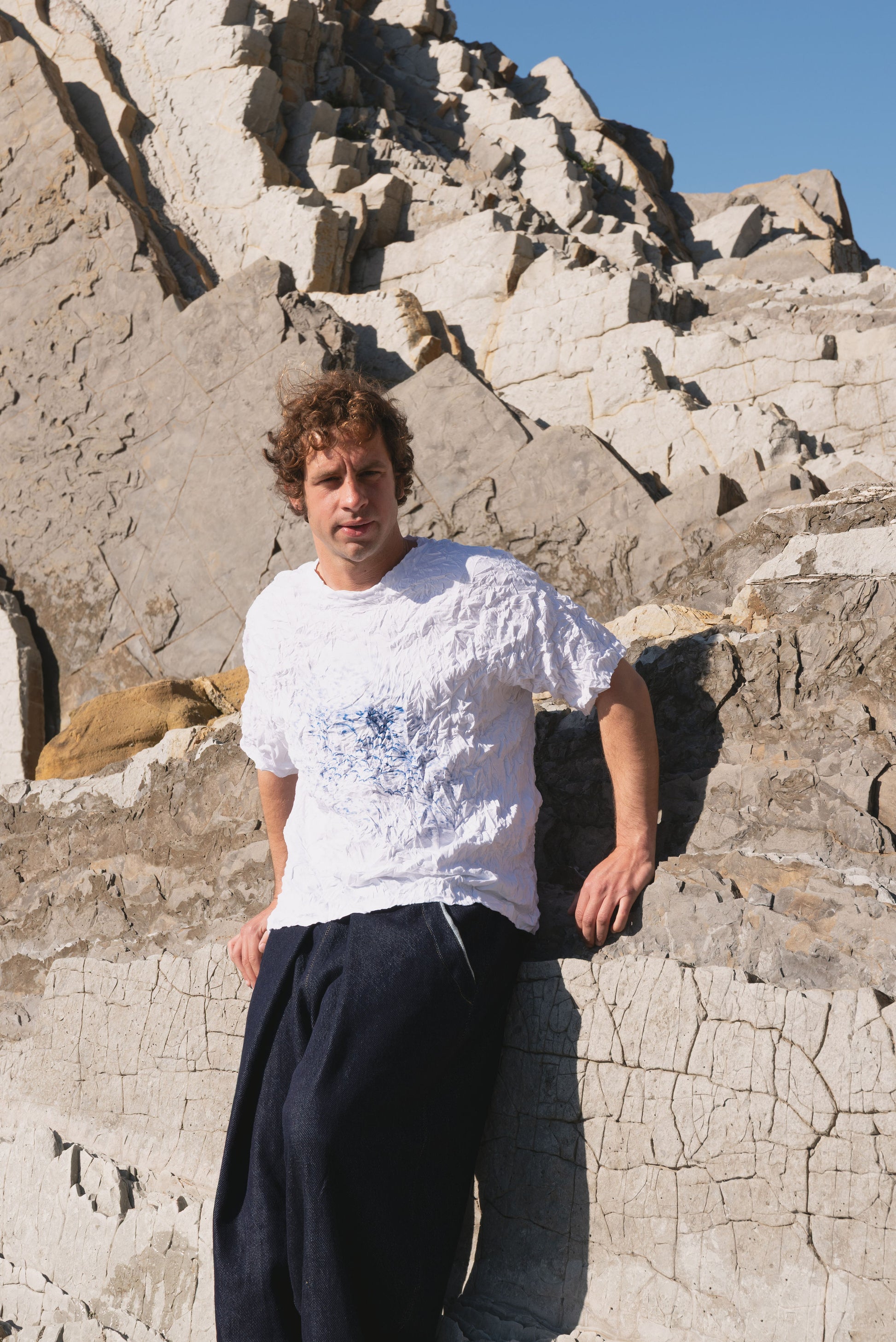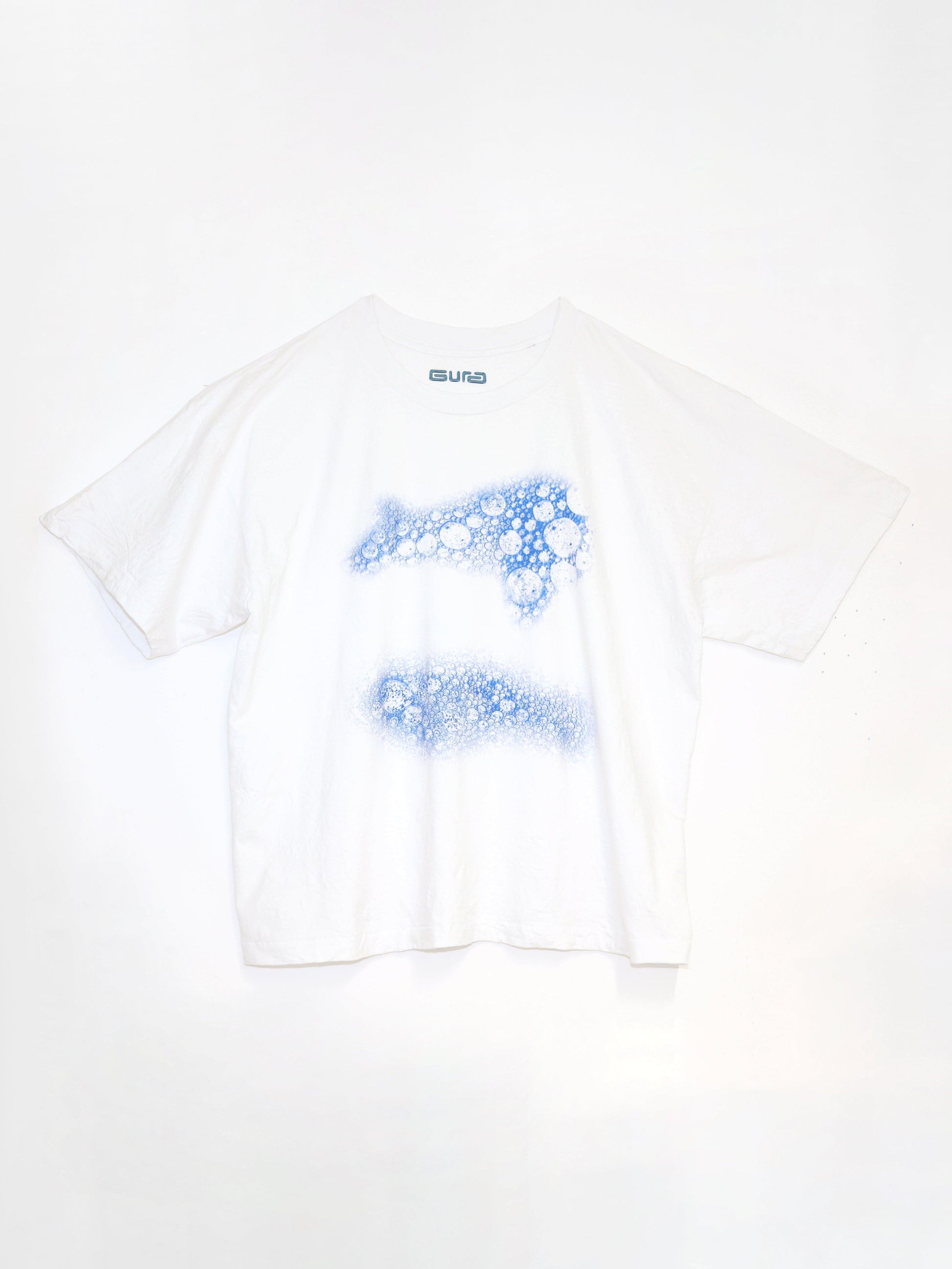 El estampado está formado por imágenes de burbujas en las orillas de Sopelana. El último rastro de la ola. Los últimos momentos antes de desaparecer. Para descompactar las camisetas se introducen en un recipiente lleno de agua y se giran poco a poco. Junto al recipiente y las camisetas se muestra un video a modo de tutorial para saber los pasos para descompactar la camiseta.