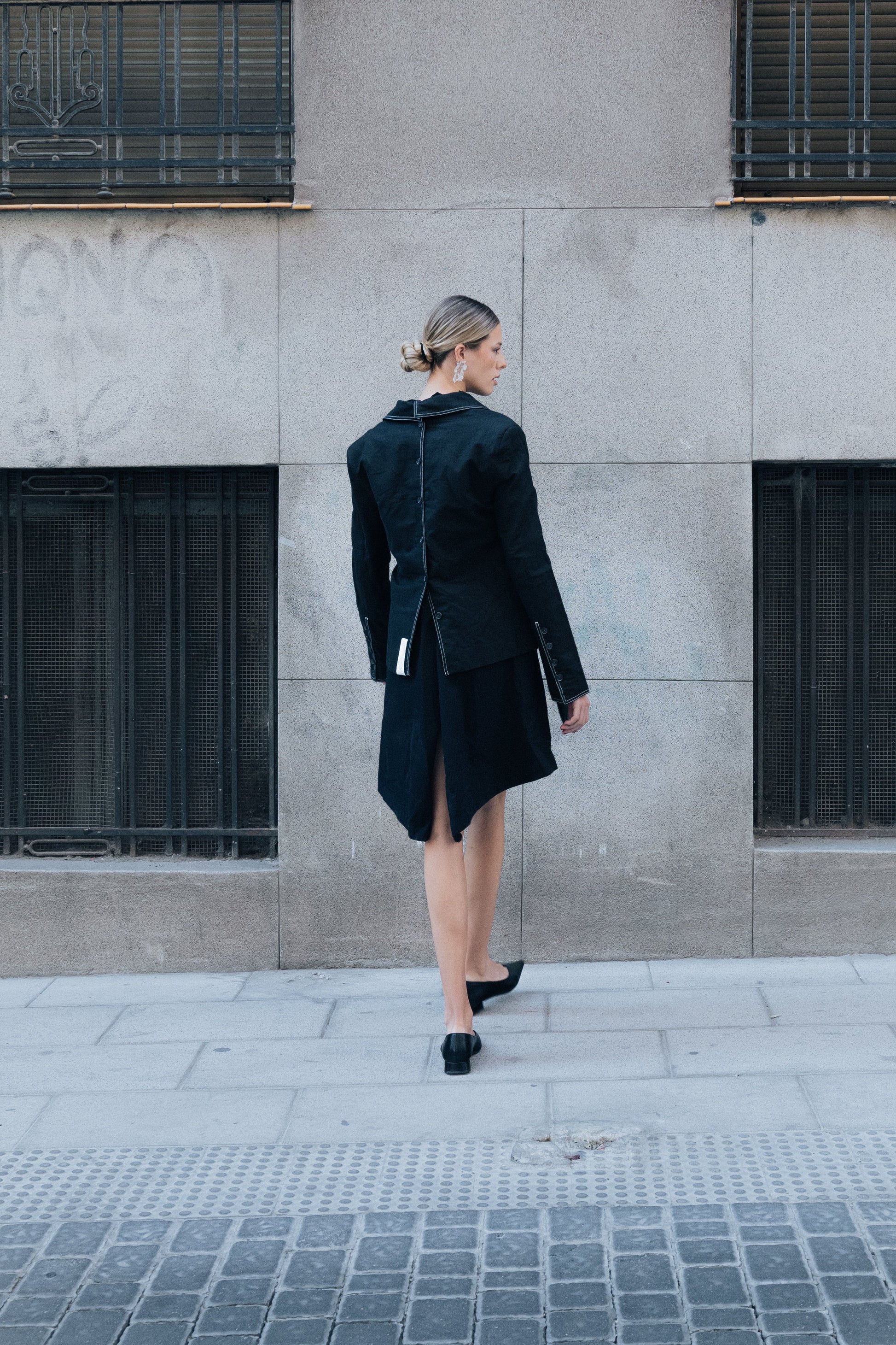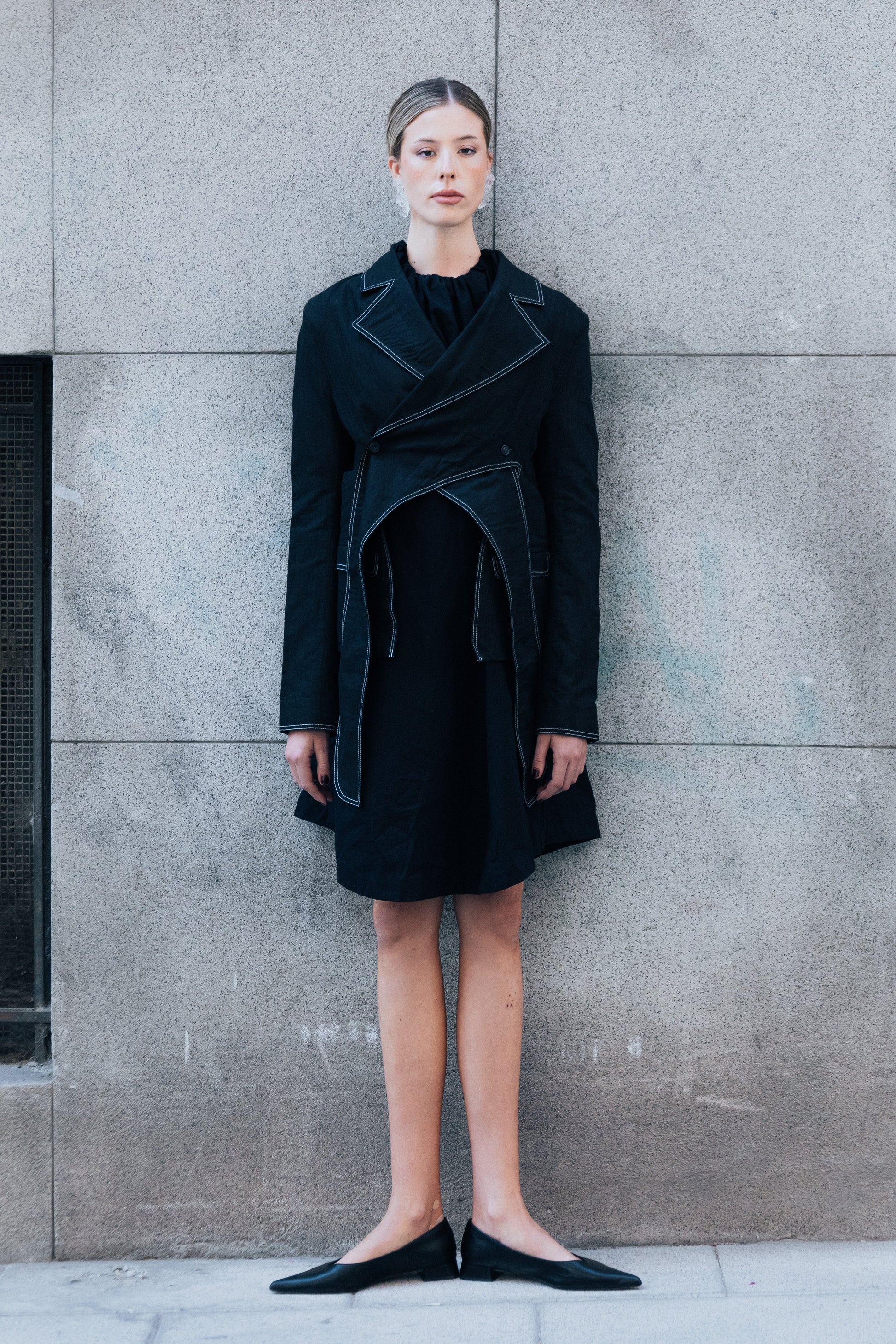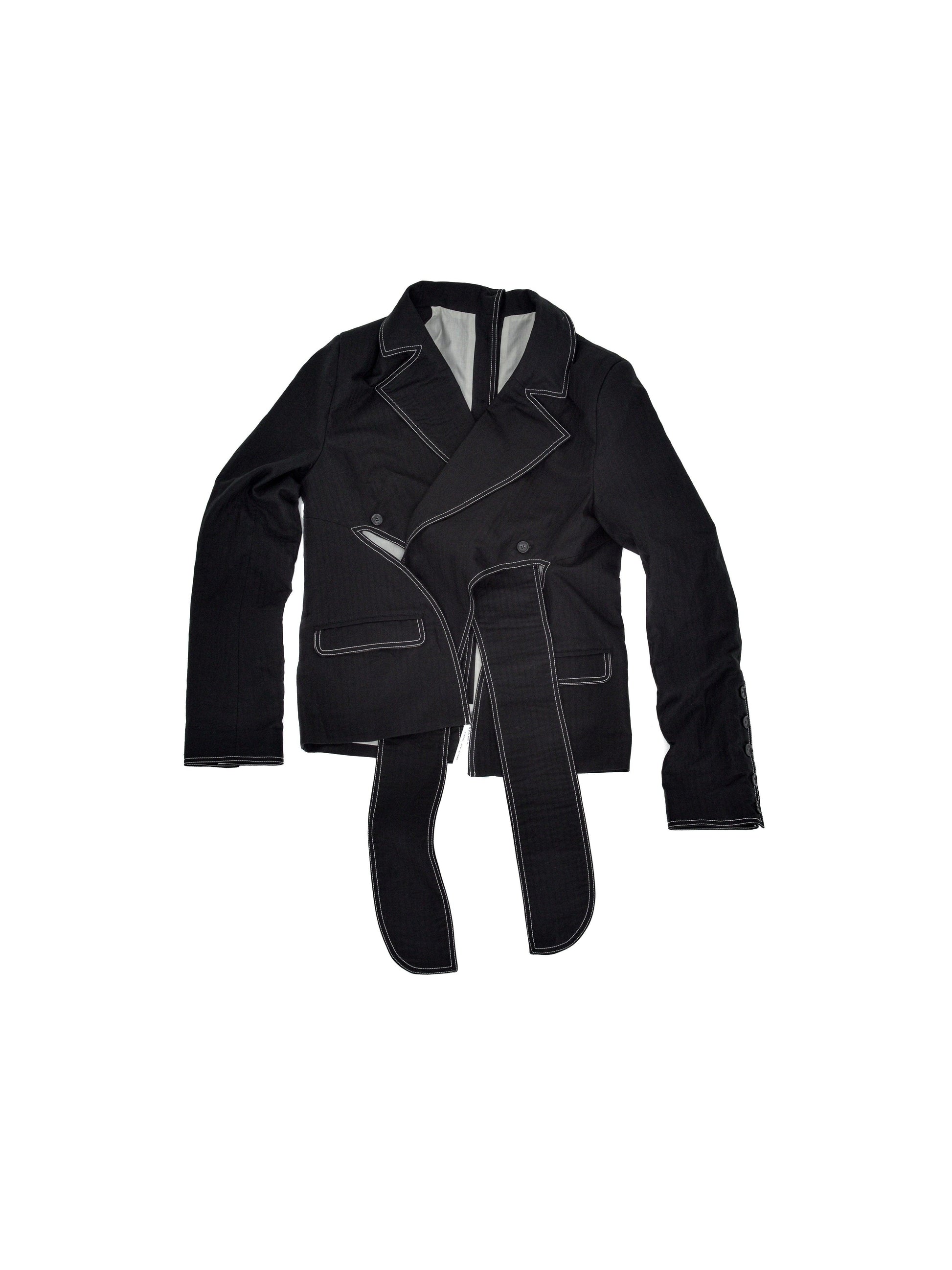 Chaqueta con solapa amplia y manga larga. Abotonadura trasera en mangas para poder llevarlo en diferentes posiciones. Cierre de botones en el centro de la espalda. Paneles delanteros centrales sueltos que ofrecen diferentes posibilidades de llevar la chaqueta. Bolsillo con ojal en la parte inferior del frente. Costuras blancas en contraste alrededor del borde.