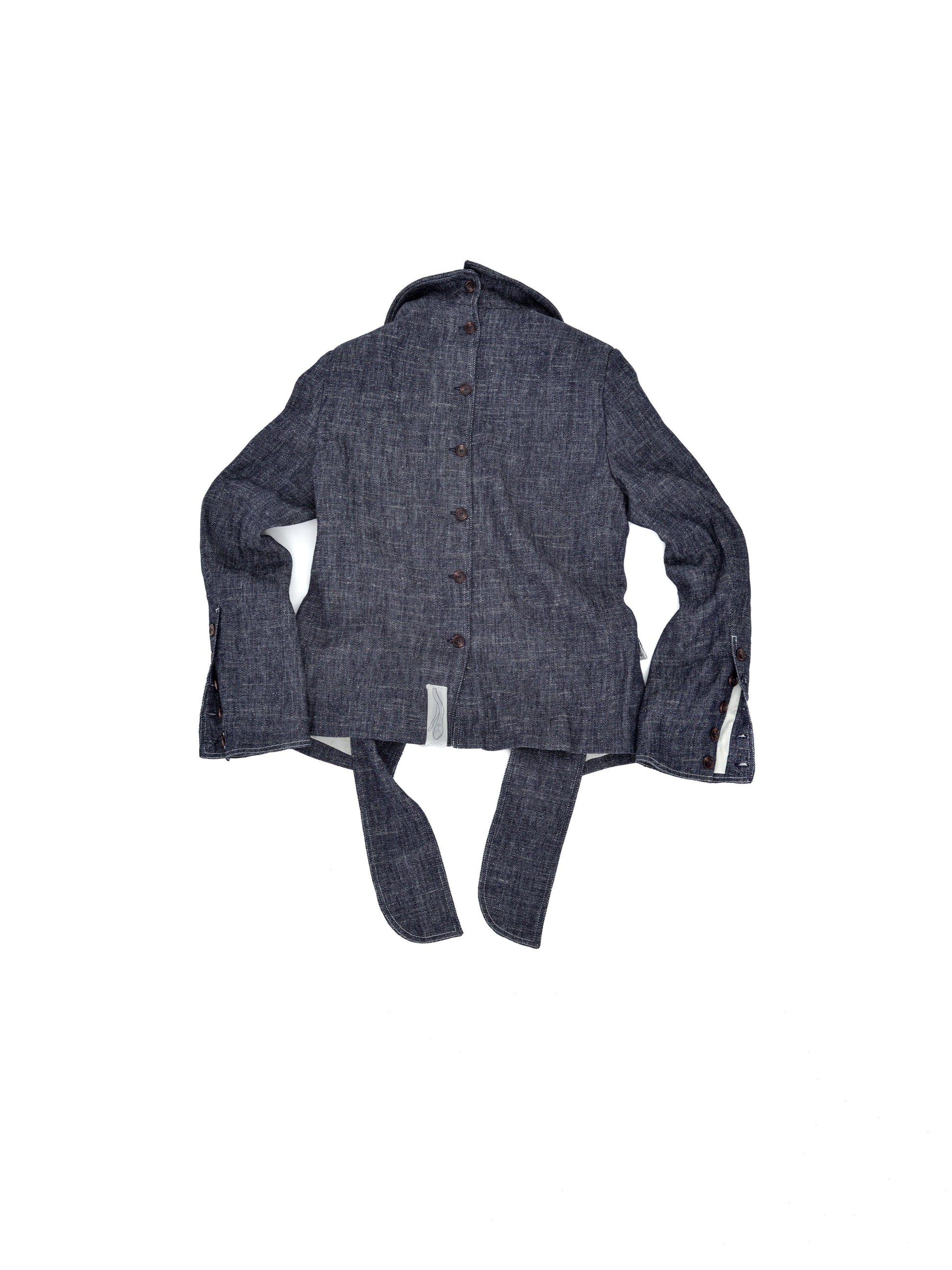 Chaqueta con solapa amplia y manga larga. Abotonadura trasera en mangas para poder llevarlo en diferentes posiciones. Cierre de botones en el centro de la espalda. Paneles delanteros centrales sueltos que ofrecen diferentes posibilidades de llevar la chaqueta. Bolsillo con ojal en la parte inferior del frente. Costuras blancas en contraste alrededor del borde.