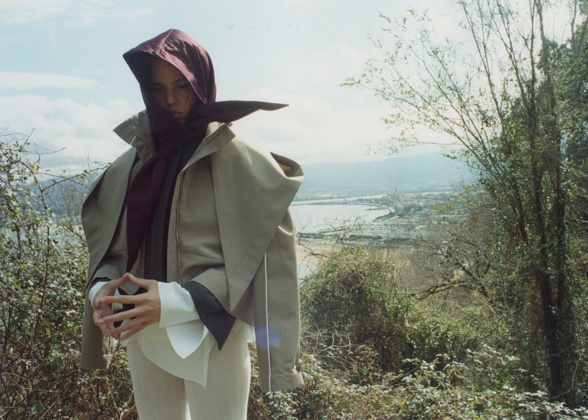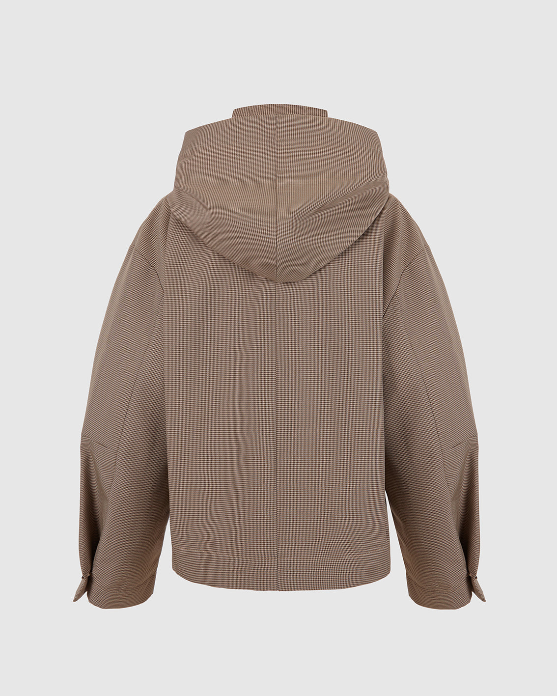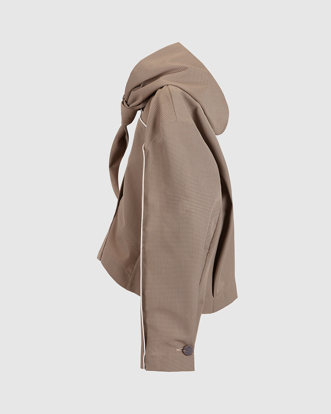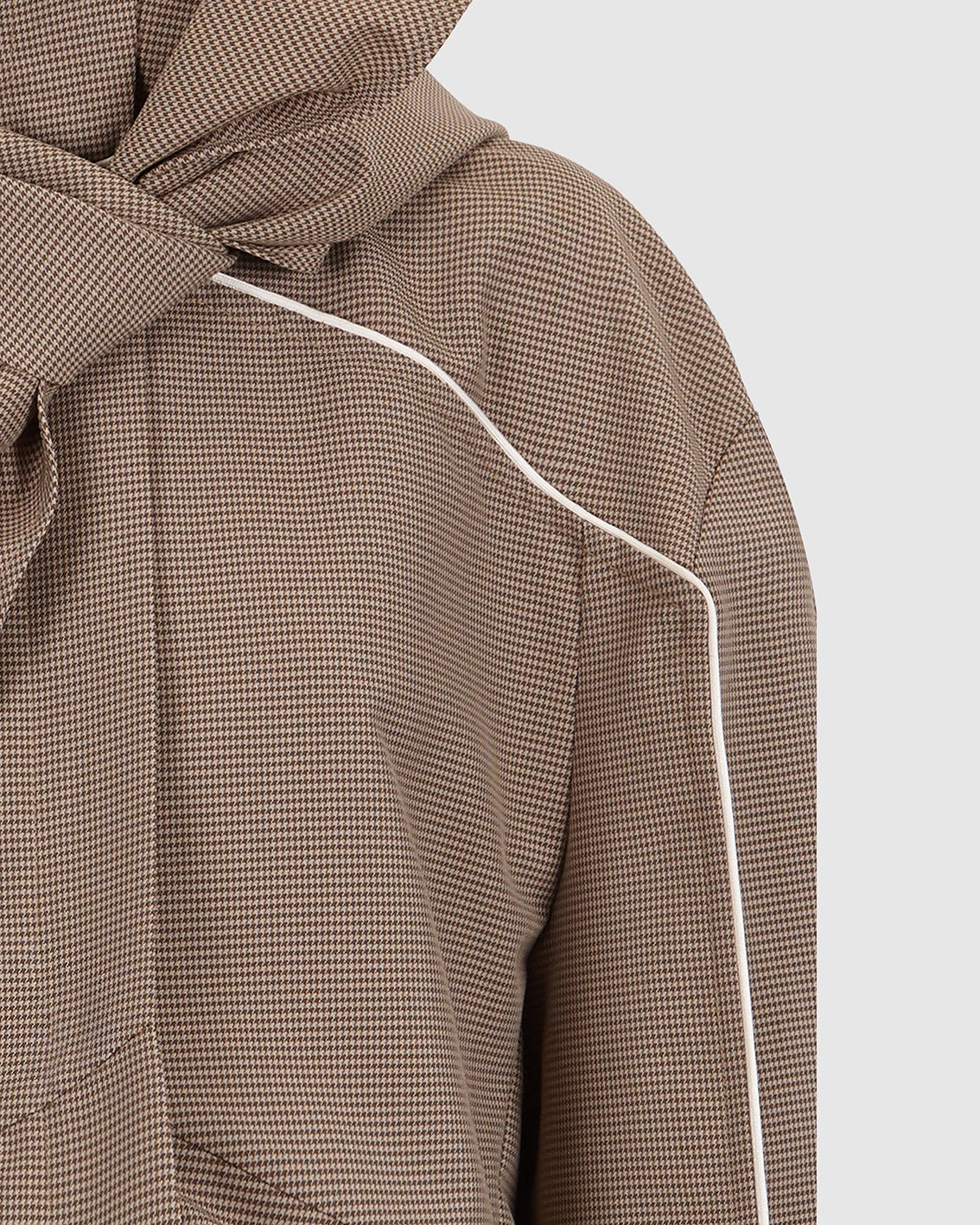 Esta parka crea una silueta audaz con una espalda envolvente que se pliega hacia adelante. El cierre frontal se realiza con una cremallera central, mientras que los ribetes blancos realzan su corte distintivo y contrastan con el tejido de inspiración pata de gallo. Incluye cuello alto, capucha tipo bufanda y mangas definidas por un amplio pliegue cerrado con un botón. El interior sin forro presenta un elegante acabado con costuras ribeteadas y un bolsillo en el pecho.