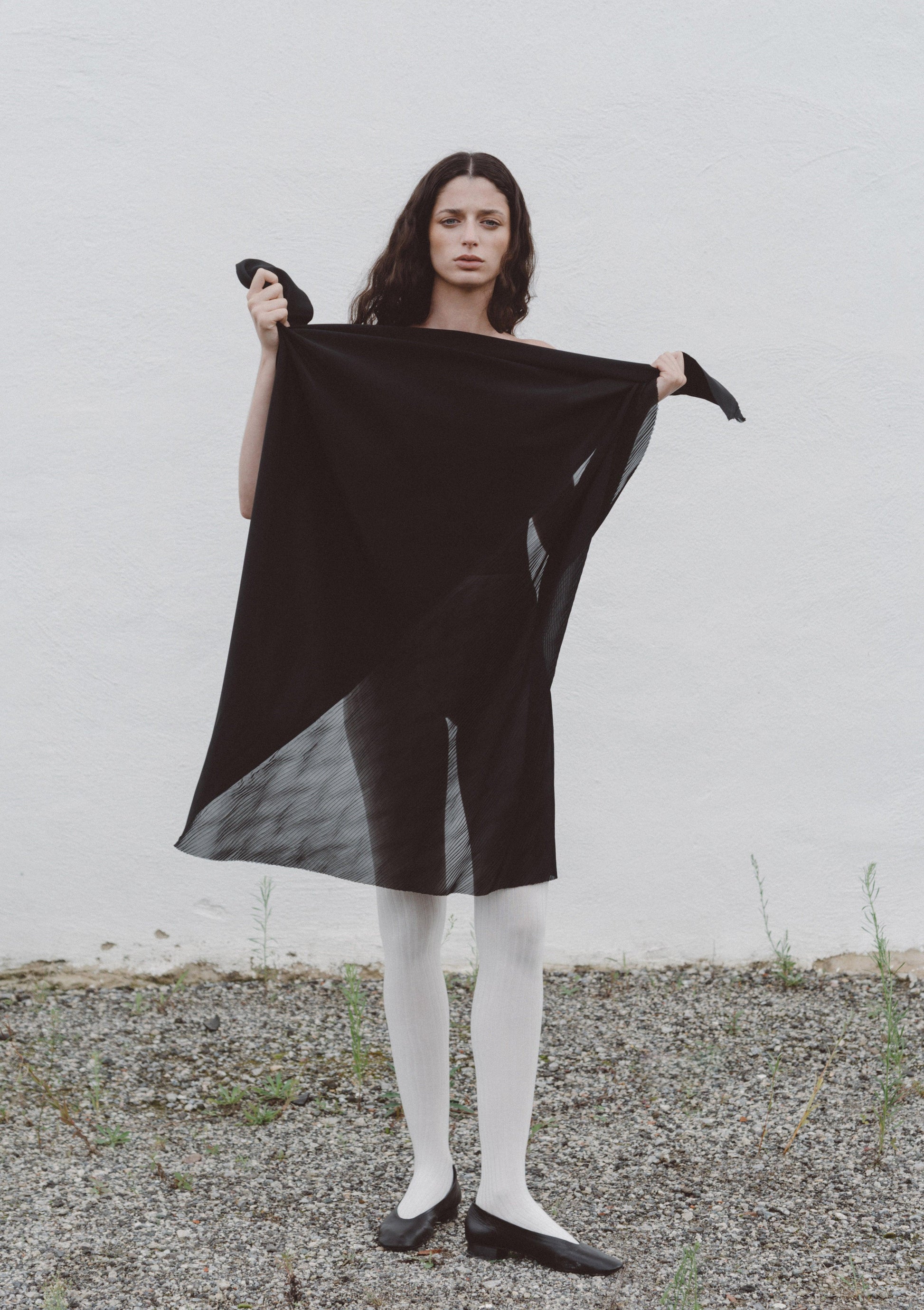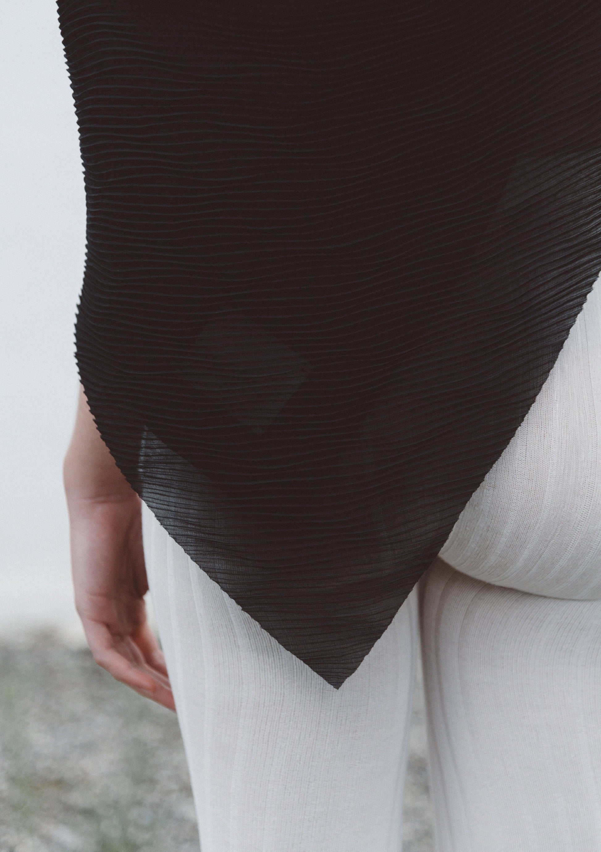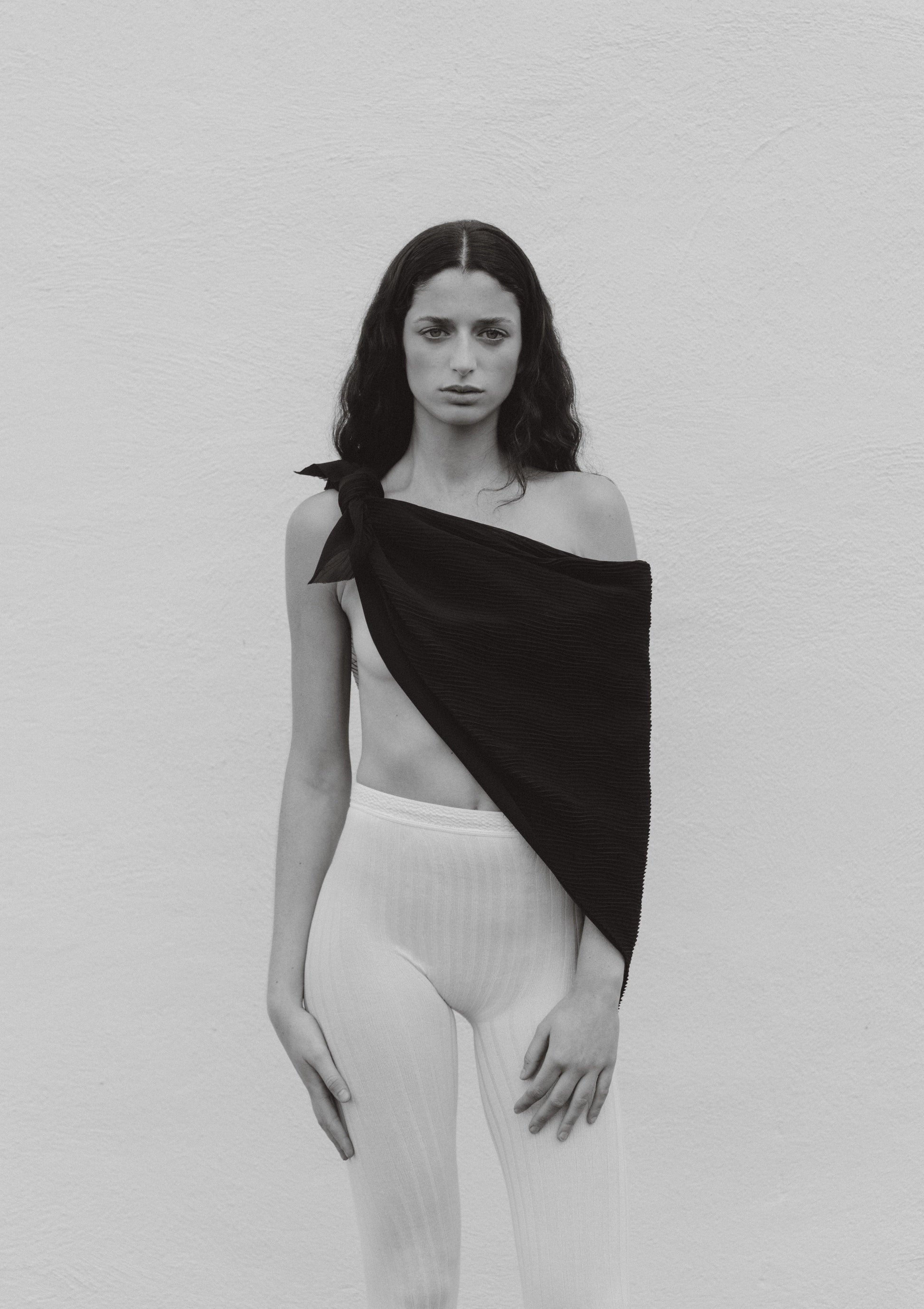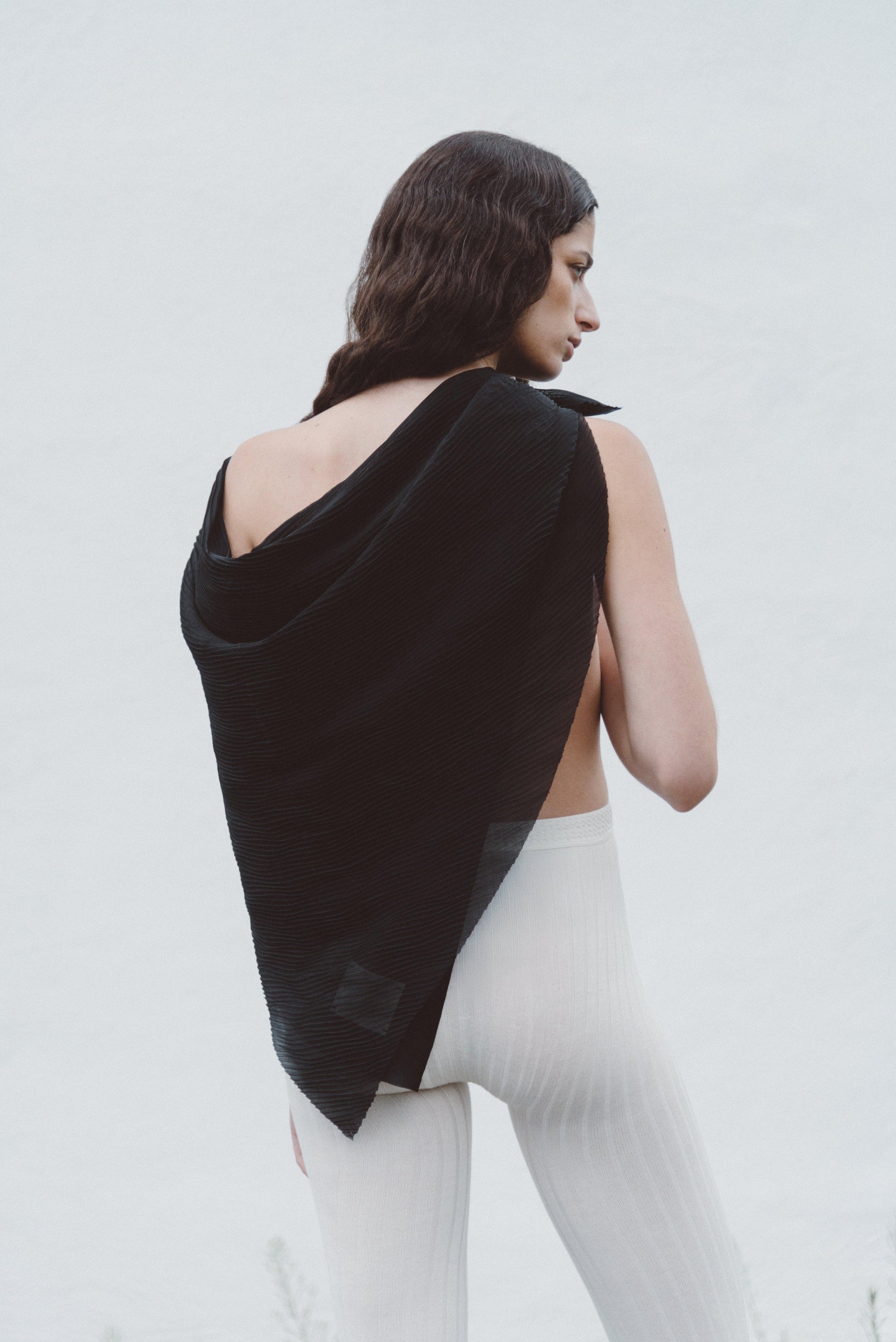 Esta icónica prenda presenta una mitad de tela plisada sobre una base de viscosa con efecto jaspeado. Su generoso tamaño permite combinarla de diversas maneras, creando nuevas siluetas con cada look.