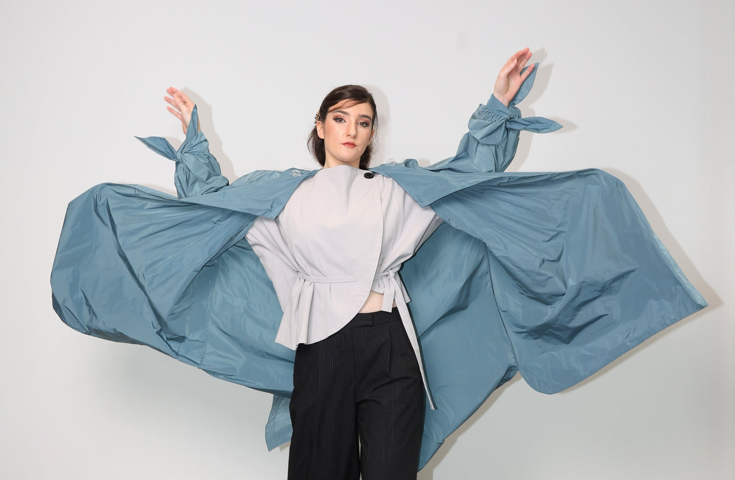 Abrigo cruzado con doble cuello. Cierre con botones y canesú que cubre los hombros delanteros y toda la espalda. Ligero fruncido en la espalda para dejar un poco más de caída.