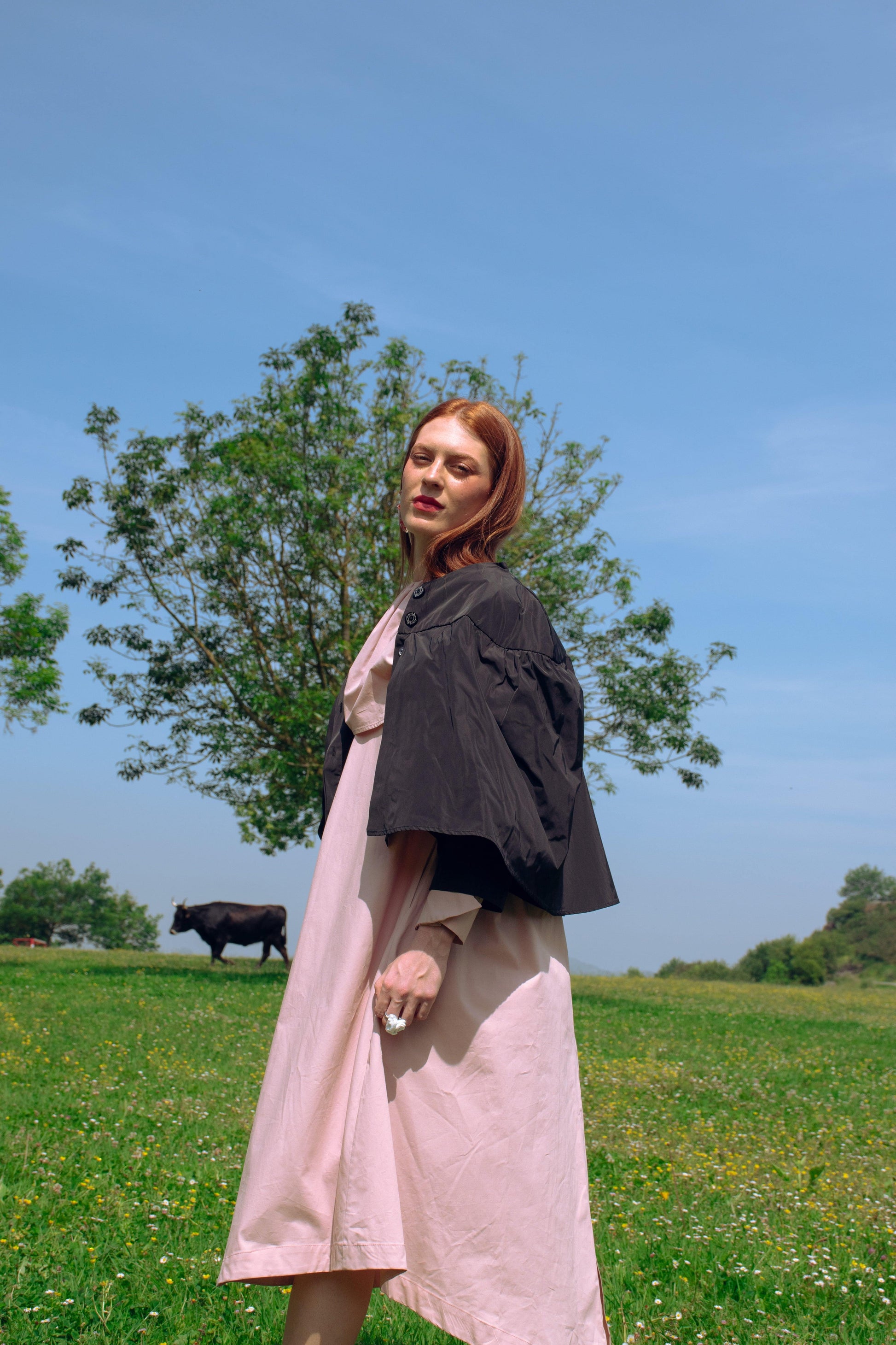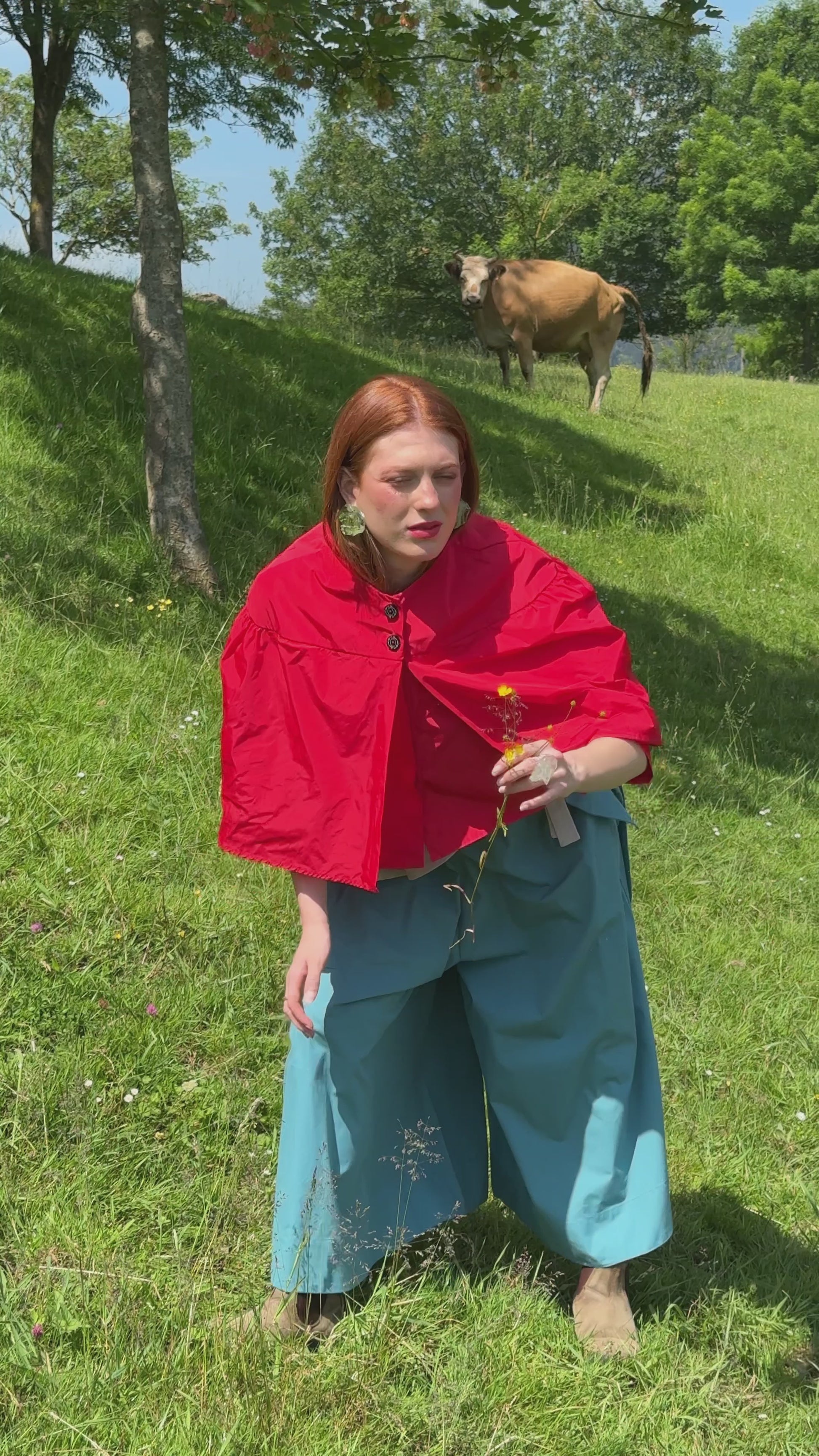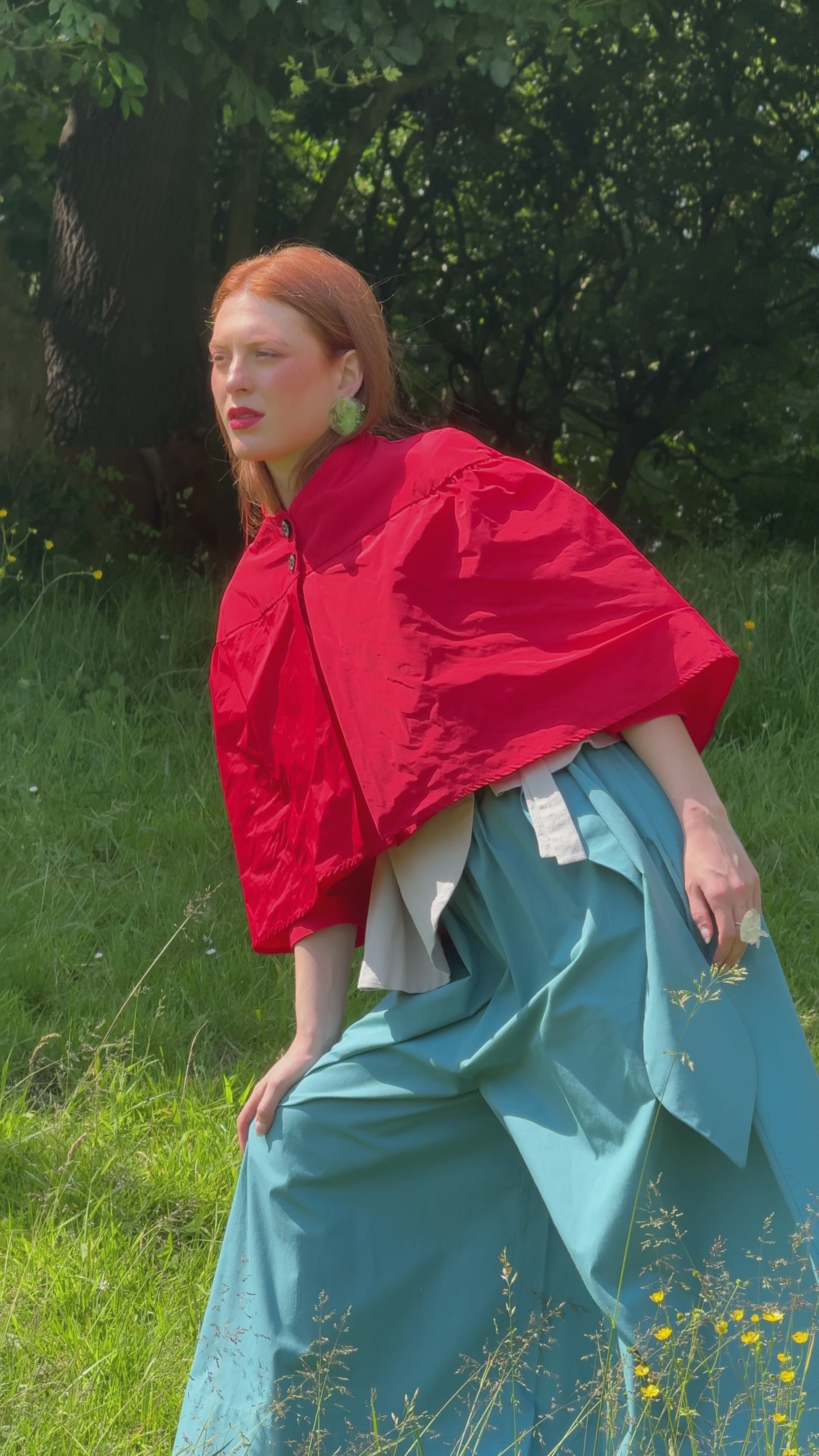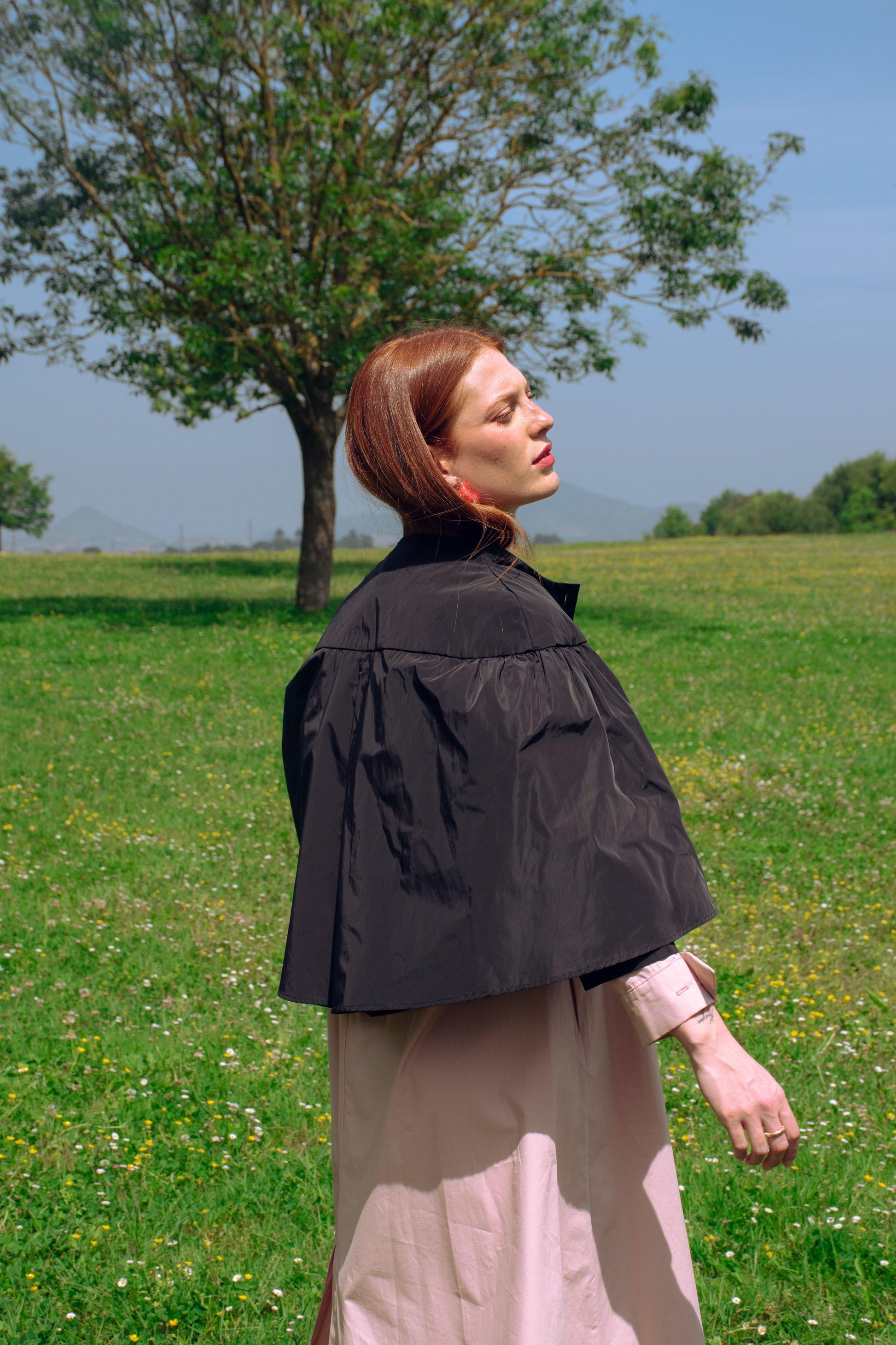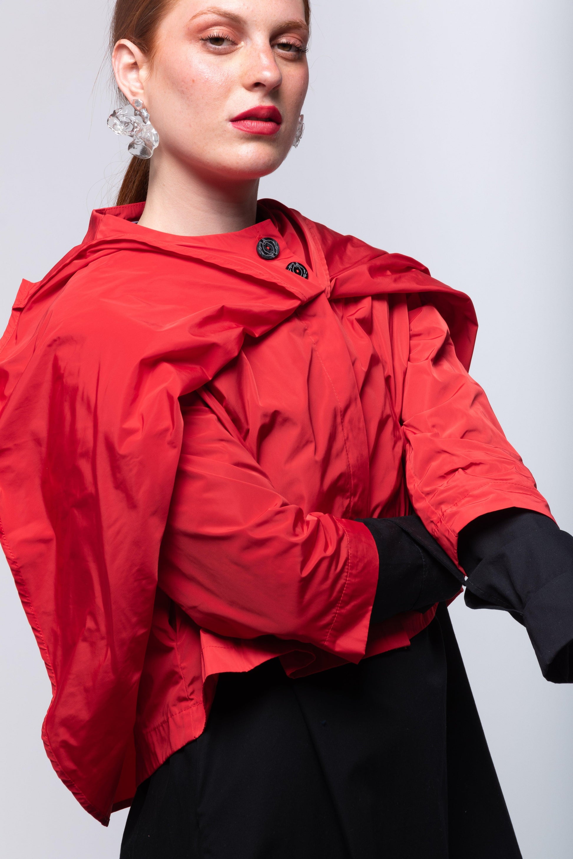 Chaqueta corta con canesú y capa superior que se cierra con botones. Cuerpo inferior de la chaqueta con bolsillos laterales. La chaqueta inferior es más larga que la capa superior.