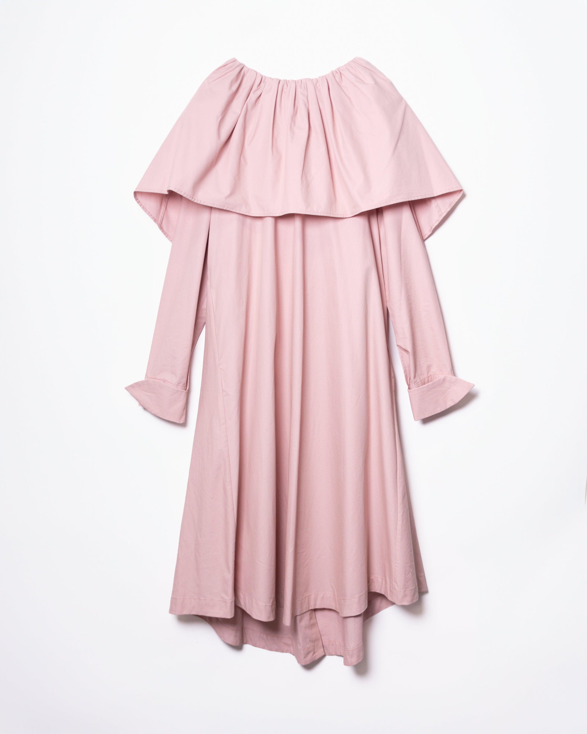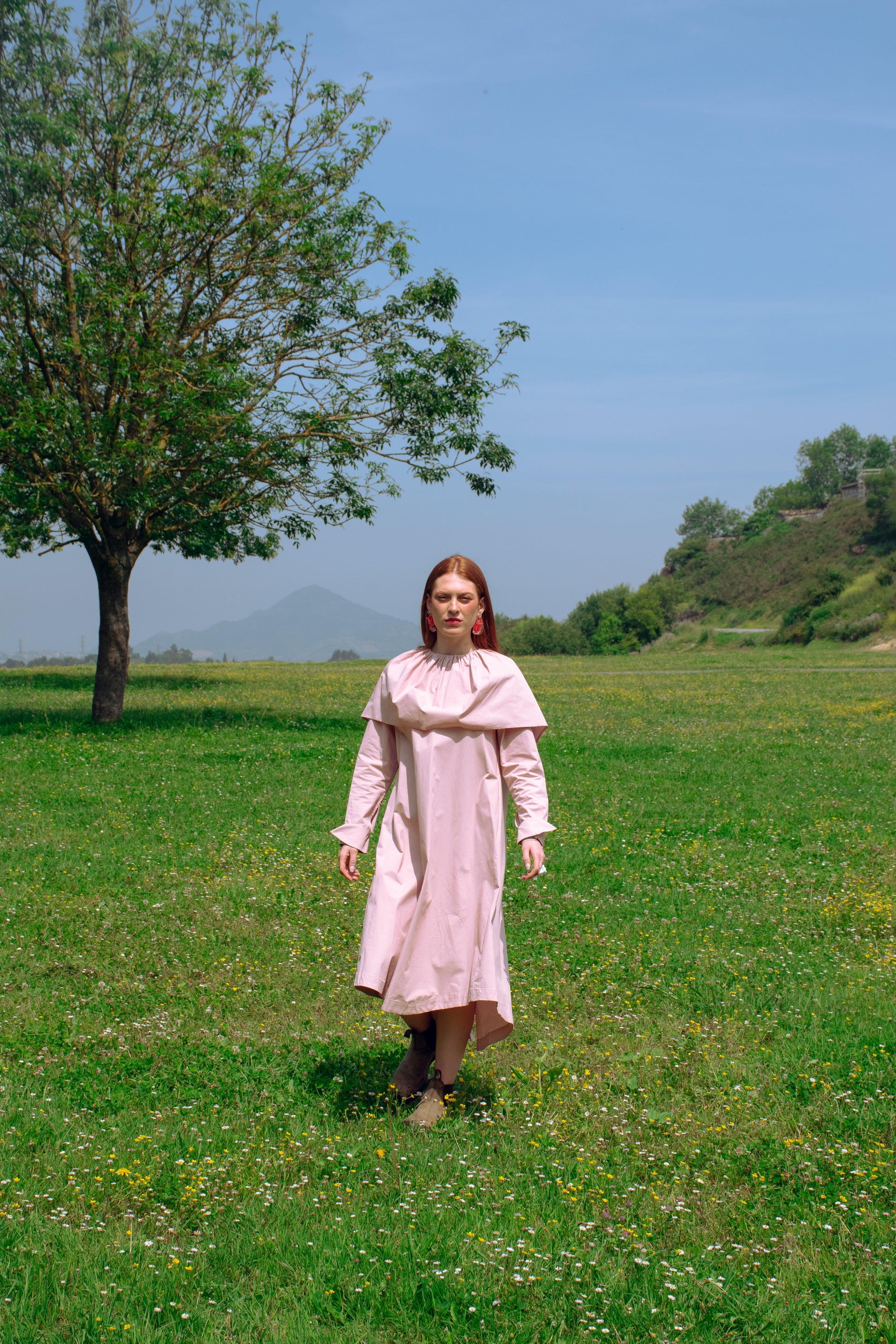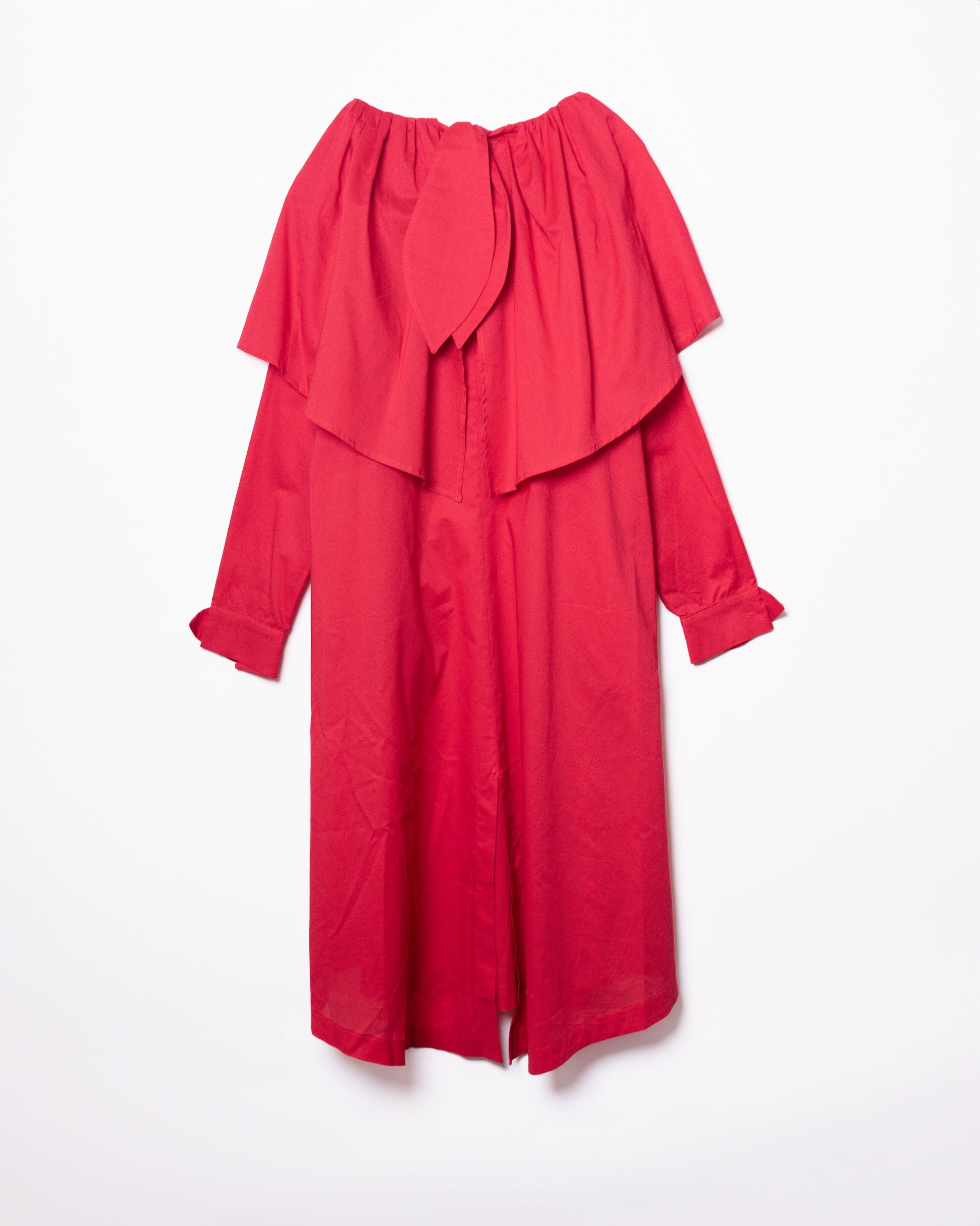 Vestido de silueta midi, llega por debajo de la rodilla. Viste con una capa que parte del cuello y es fruncida. Se cierra con un lazo en forma de hoja en la parte trasera. El pelaje es más corto por delante que por detrás. Vestido de manga larga cerrado con lazo. Espalda baja, con abertura perfilada. Lados laterales con forma.