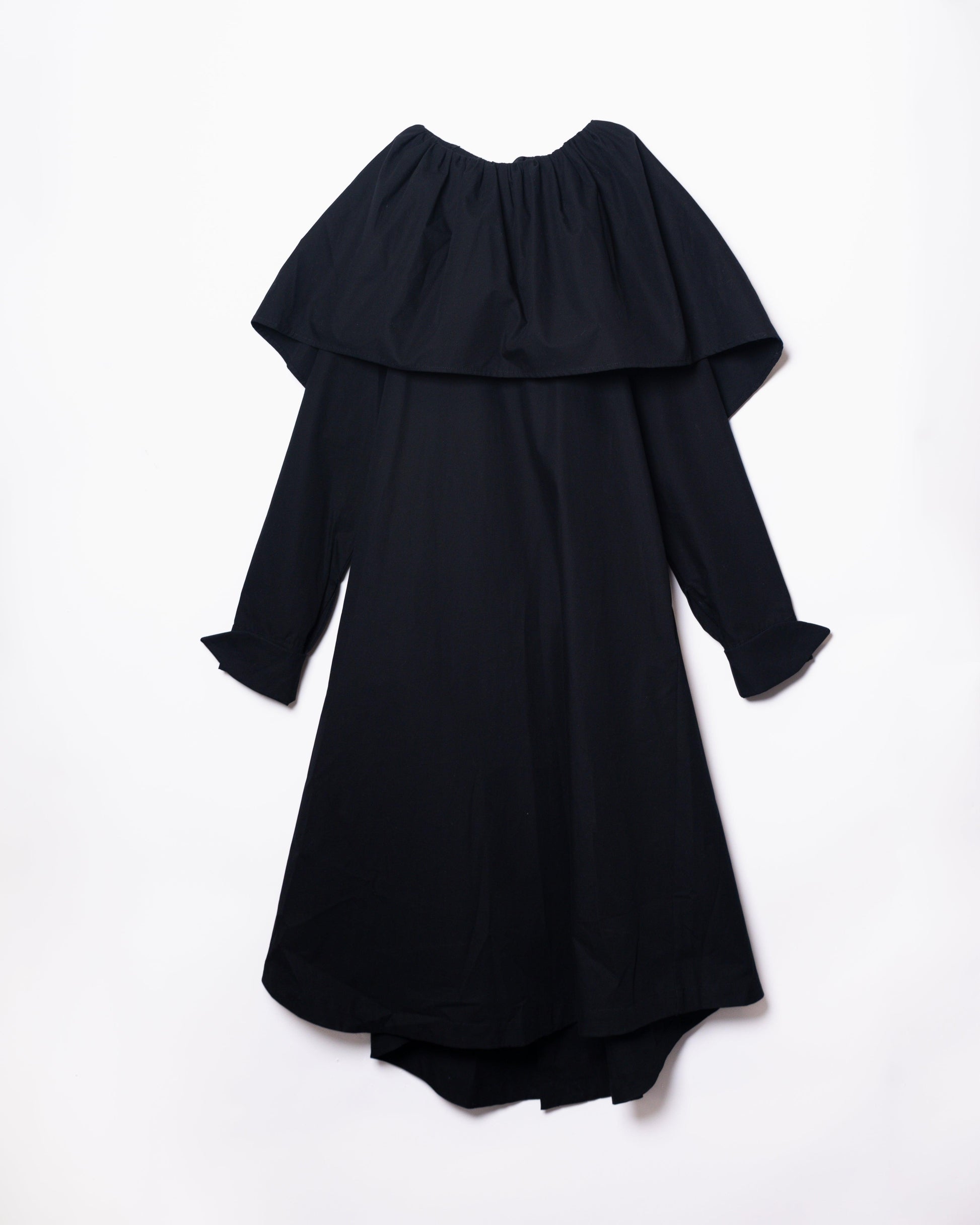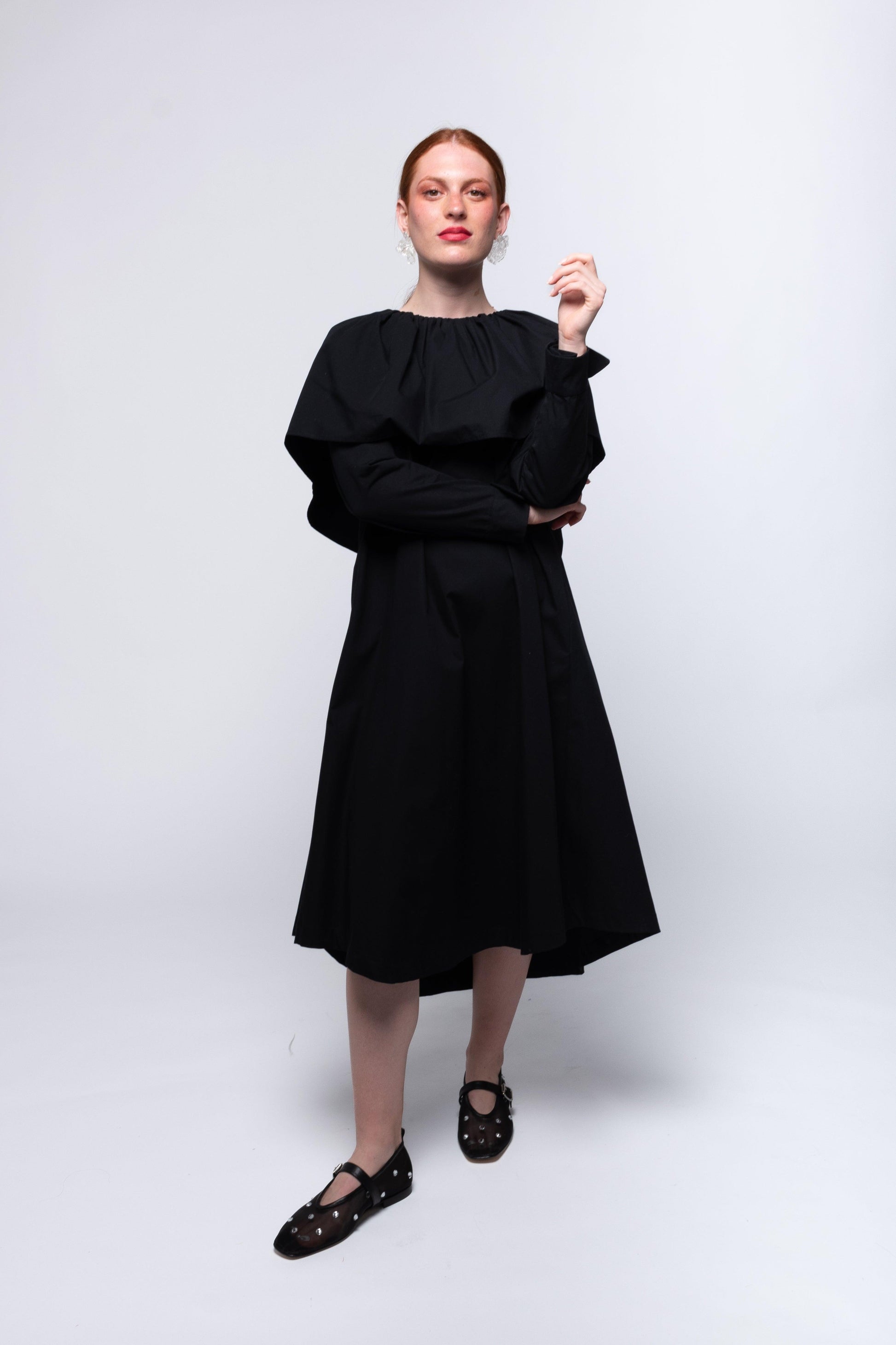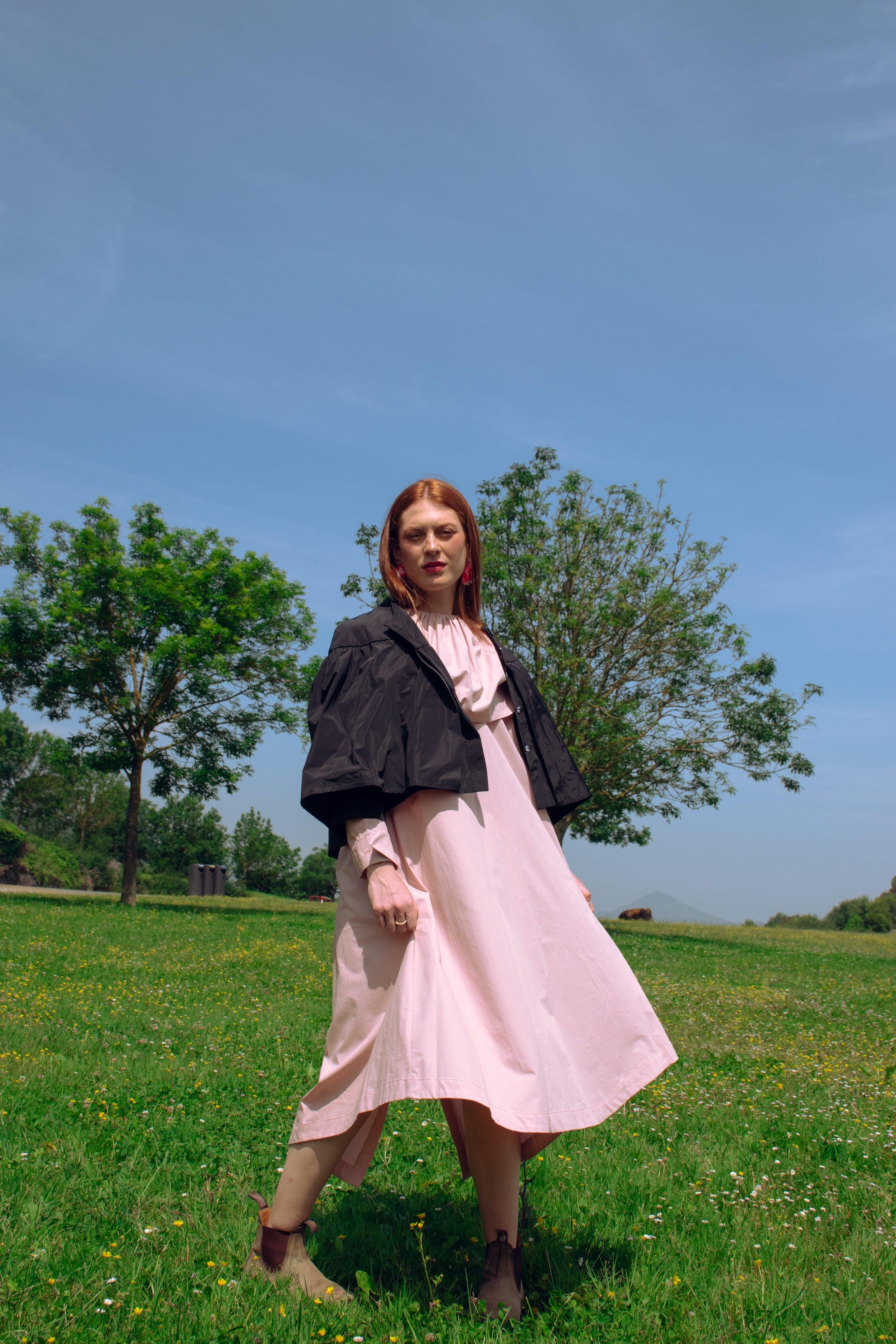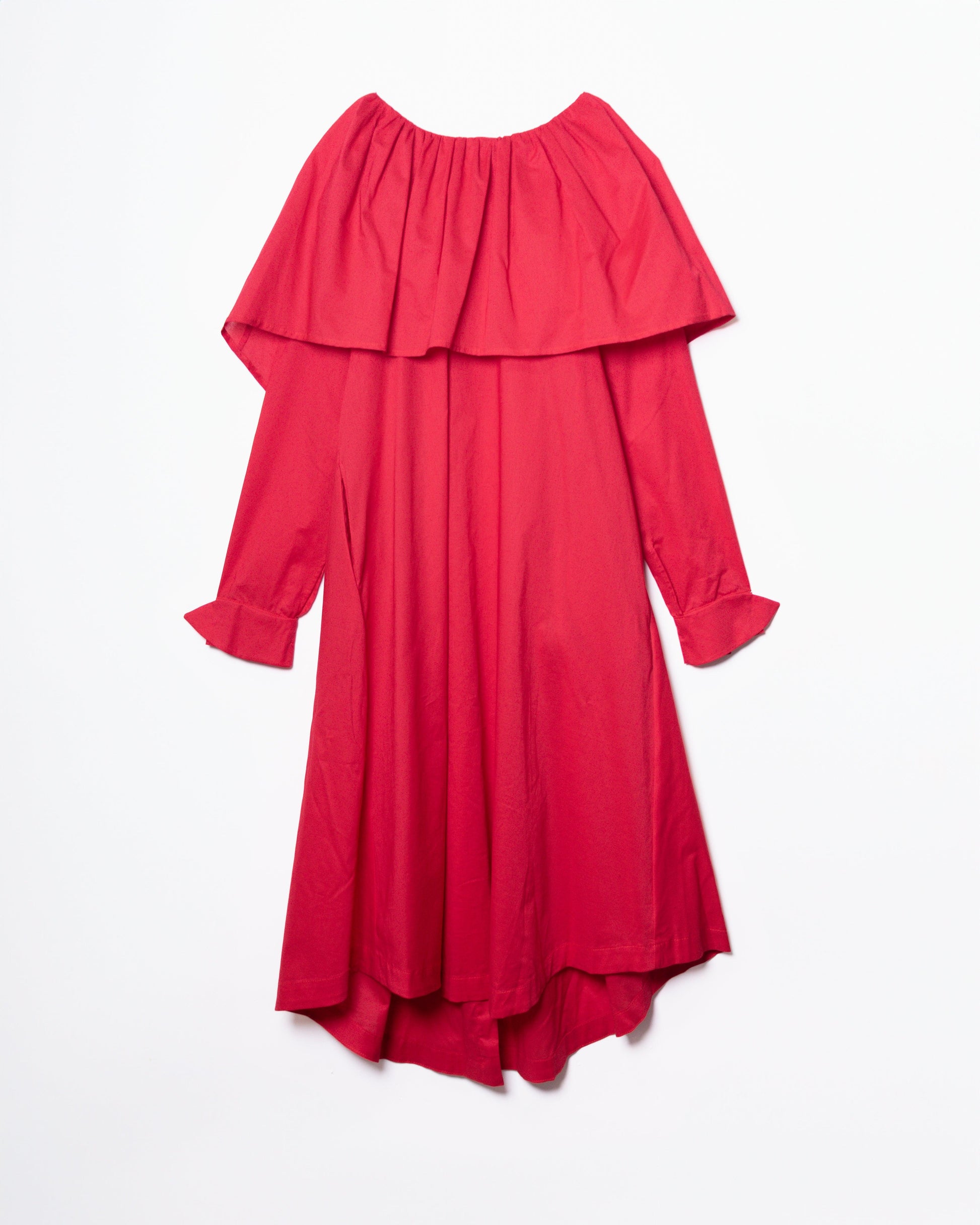 Vestido de silueta midi, llega por debajo de la rodilla. Viste con una capa que parte del cuello y es fruncida. Se cierra con un lazo en forma de hoja en la parte trasera. El pelaje es más corto por delante que por detrás. Vestido de manga larga cerrado con lazo. Espalda baja, con abertura perfilada. Lados laterales con forma.