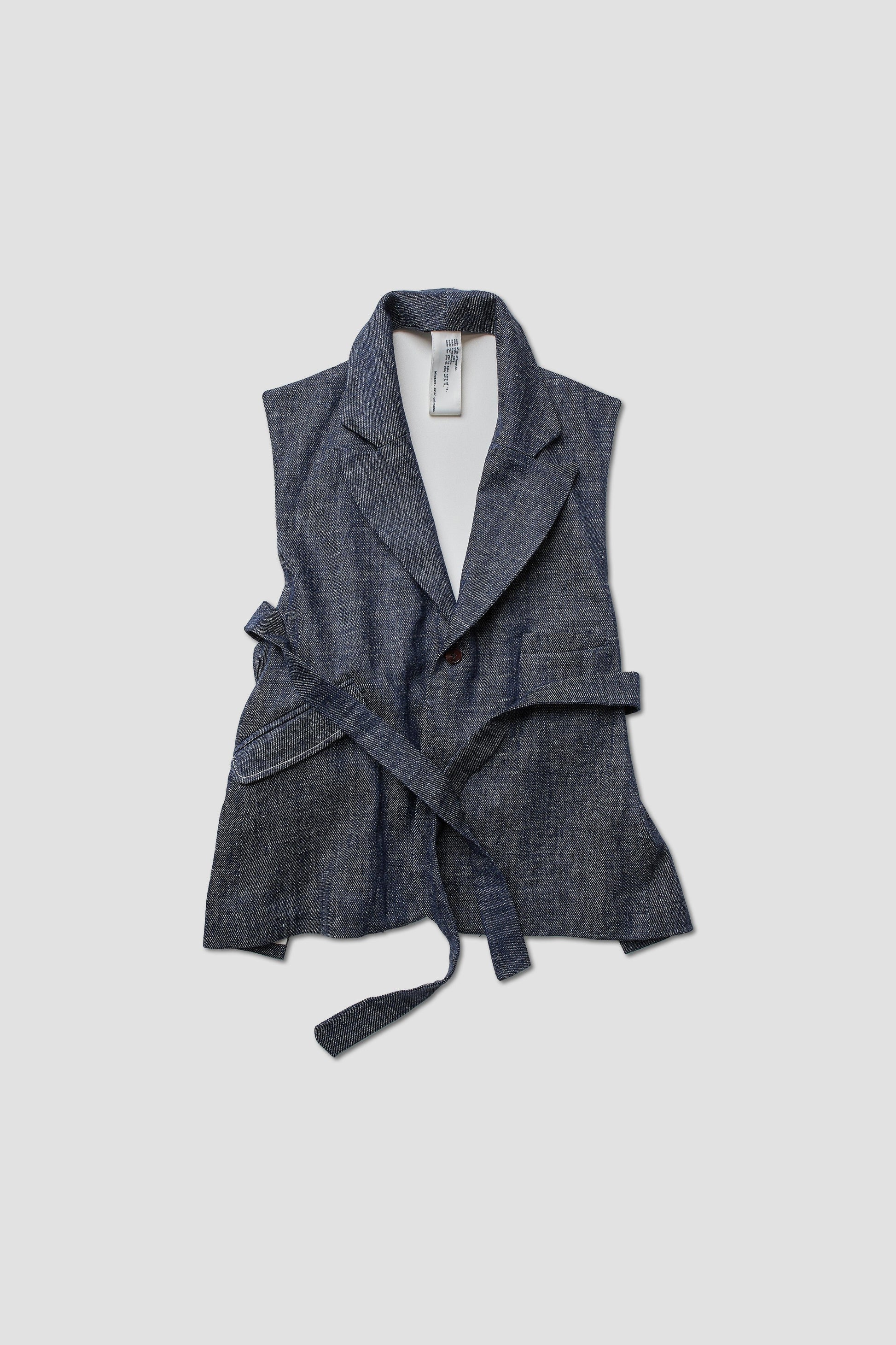 Waistcoat with sartorial elements opening at the back. Asymmetric pockets in front. Buttonhole pocket on the right front and flap pocket on the left front.