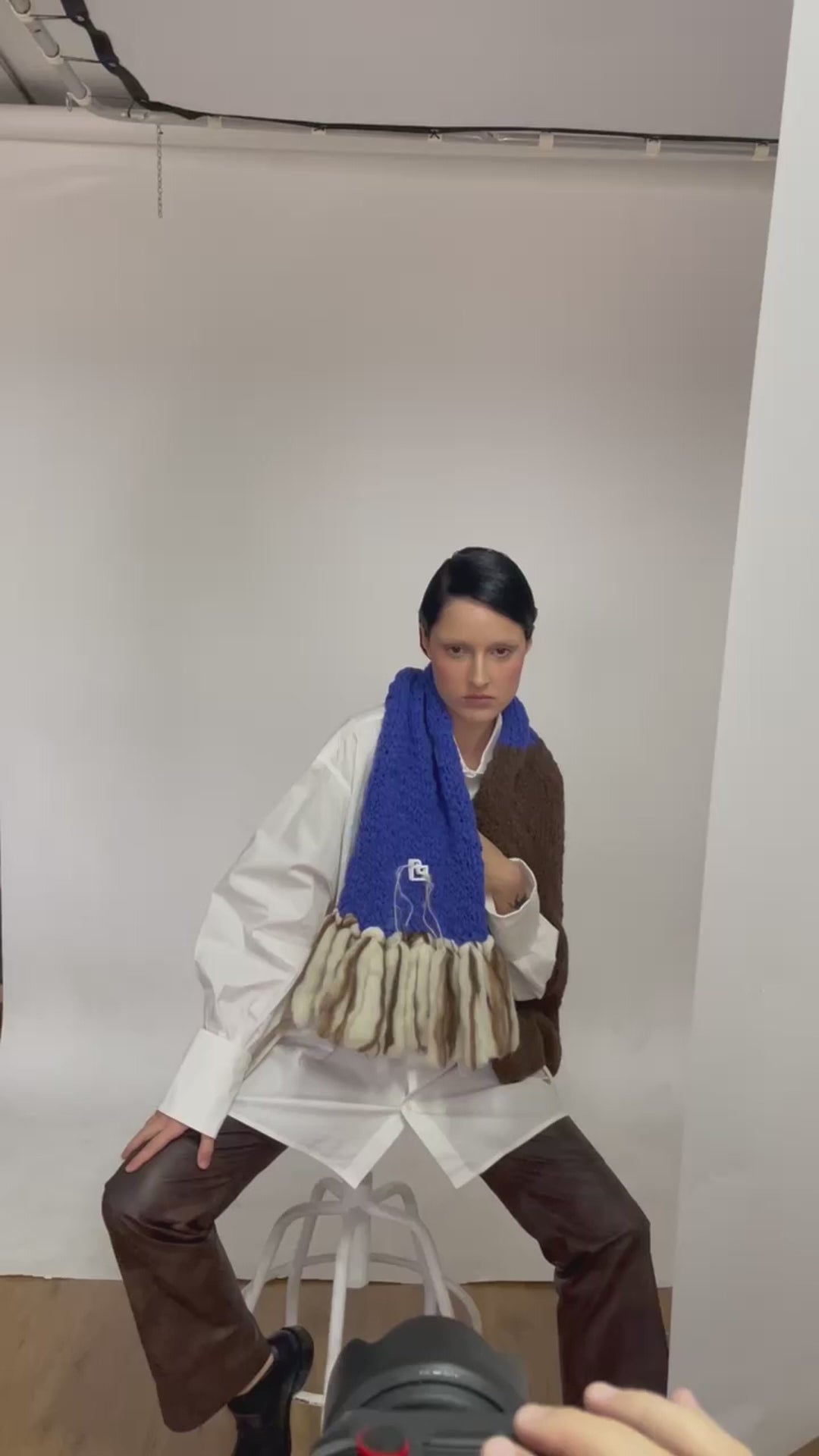 The LE BLOCK SCARF CHOCOLATE ELECTRIC BLUE is a two-tone scarf featuring a unique opening that allows for versatile styling options. Its color scheme expertly blends textures and shapes for a cohesive look. Play with the scarf by wearing it as a scarf, shawl, or in a knotted style thanks to its versatile design.