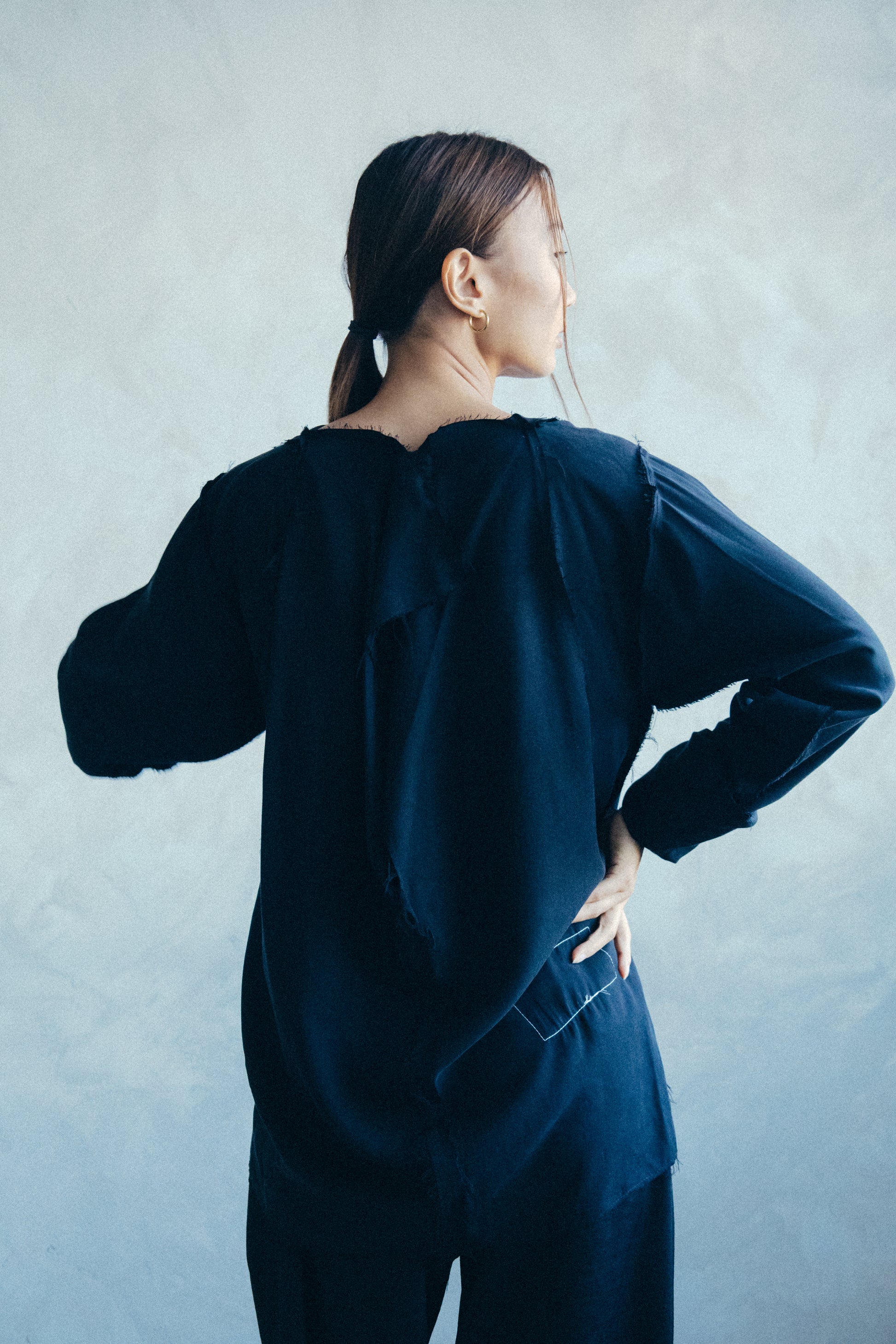 Multifunctional back can be worn open or closed. Option to cinch at the waist with a button.